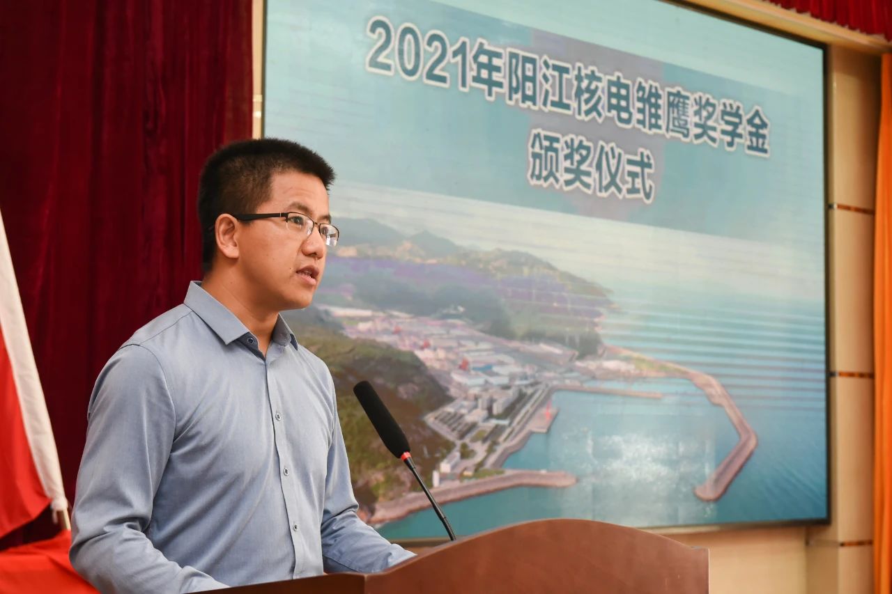 ▲陽江核電黨委副書記葉志強(qiáng)為學(xué)生頒獎(jiǎng)