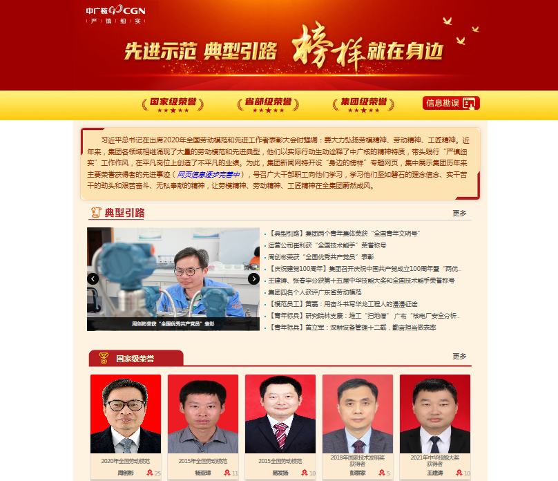 搭建“身邊的榜樣”專題網(wǎng)頁,傳播先進(jìn)典型事跡。中廣核策劃推出“身邊的榜樣”專題網(wǎng)頁,按照國家級、省部級、集團(tuán)級分類梳理建立個(gè)人榮譽(yù)檔案,集中展示先進(jìn)典型的主要榮譽(yù)、工作經(jīng)歷、歷年獲獎情況、先進(jìn)事跡、主要貢獻(xiàn)及相關(guān)事跡報(bào)道,以身邊榜樣的優(yōu)秀事跡,展現(xiàn)中廣核人的優(yōu)良傳統(tǒng),彰顯中廣核人的精神底色。