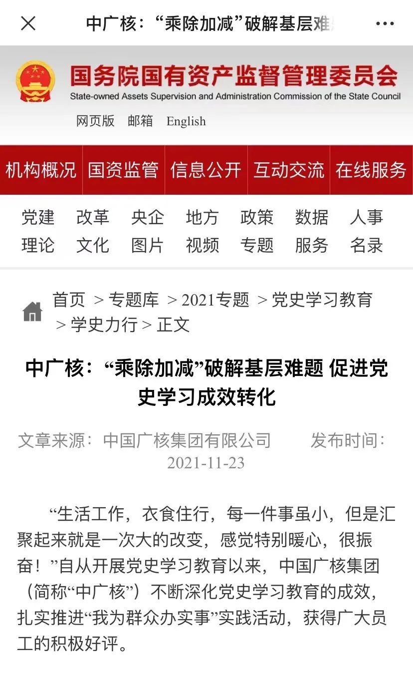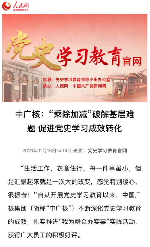 近日,黨史學習教育官網、國務院國資委官網、學習強國中央企業學習平臺等刊發了題為《中廣核:“乘除加減”破解基層難題,促進黨史學習成效轉化》專題報道,從四個方向闡述了中國廣核集團持續深化黨史學習教育,促進成效轉化,重點聚焦基層一線員工、科研人員、偏遠項目人員“急難愁盼”問題,用實際行動持續辦實事辦好事,大力營造攜手團結奮斗、共筑復興偉業的濃厚氛圍,強化思想引領、凝聚發展合力。