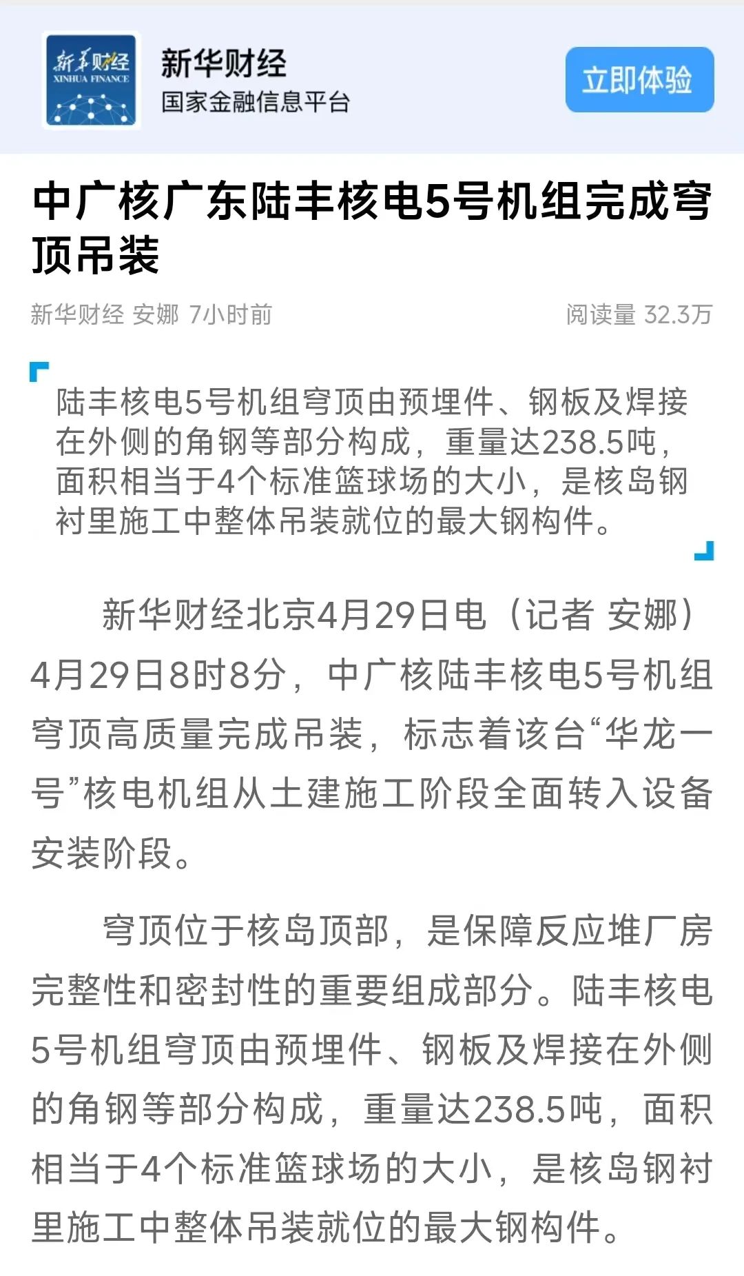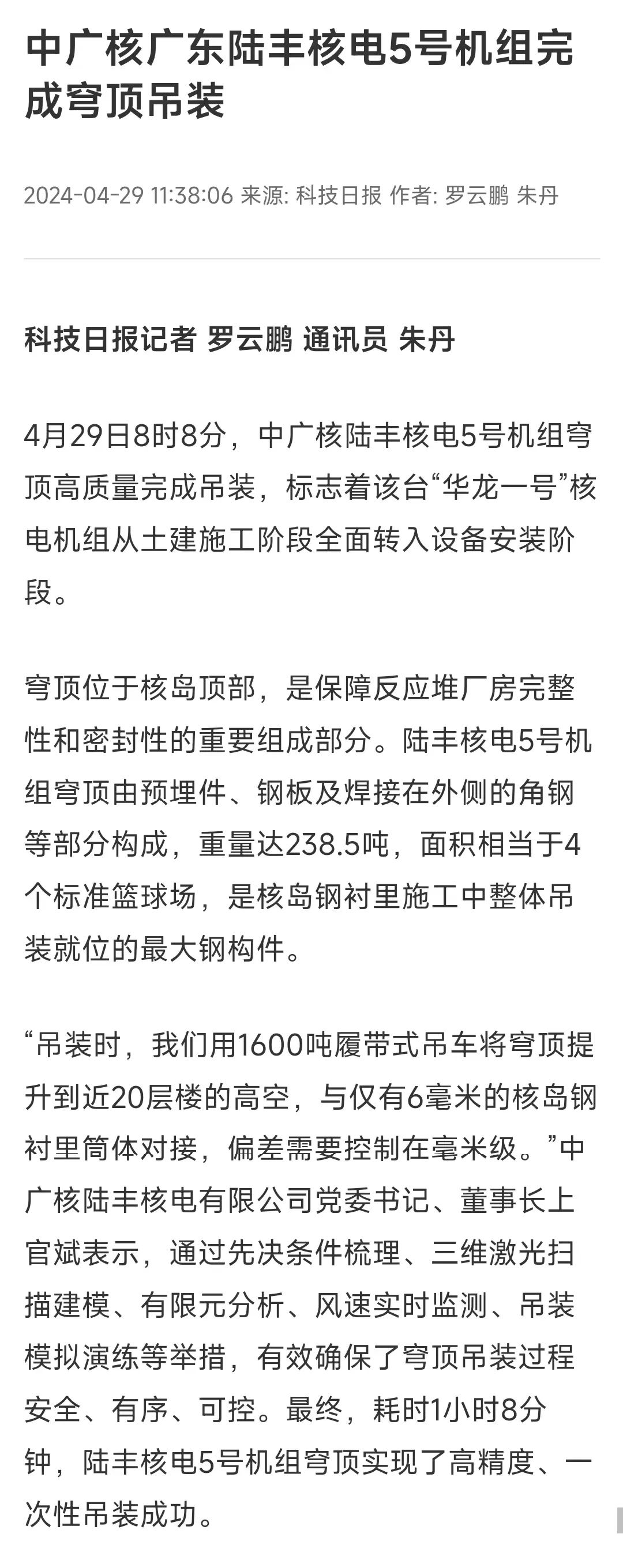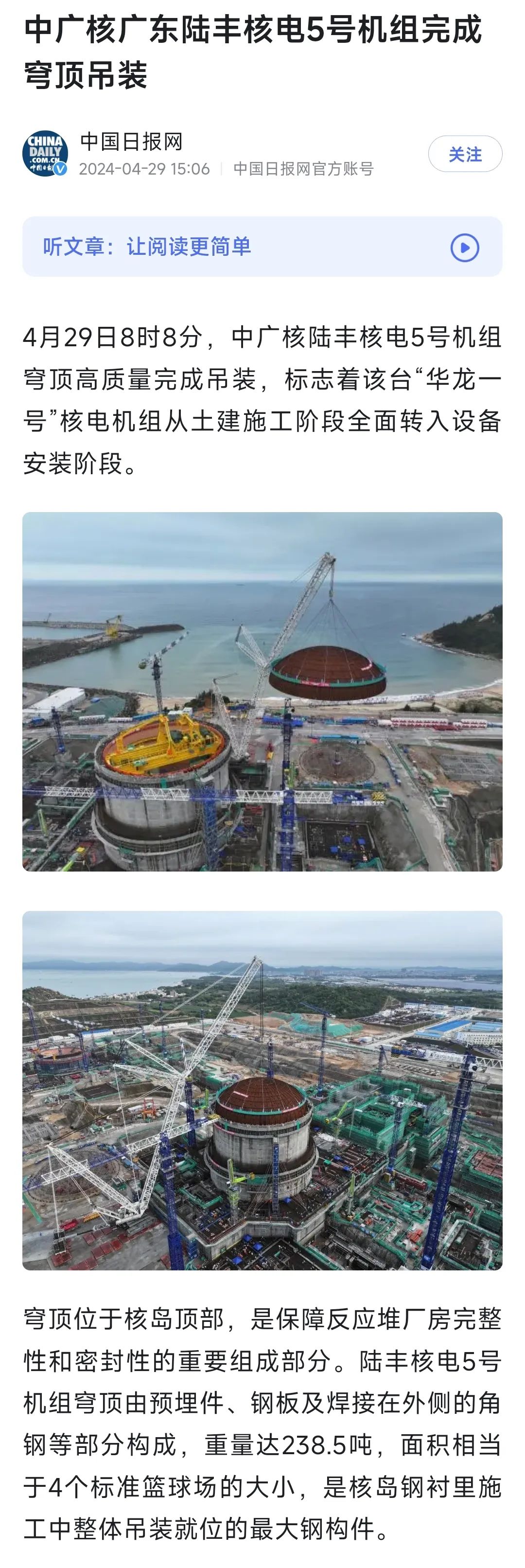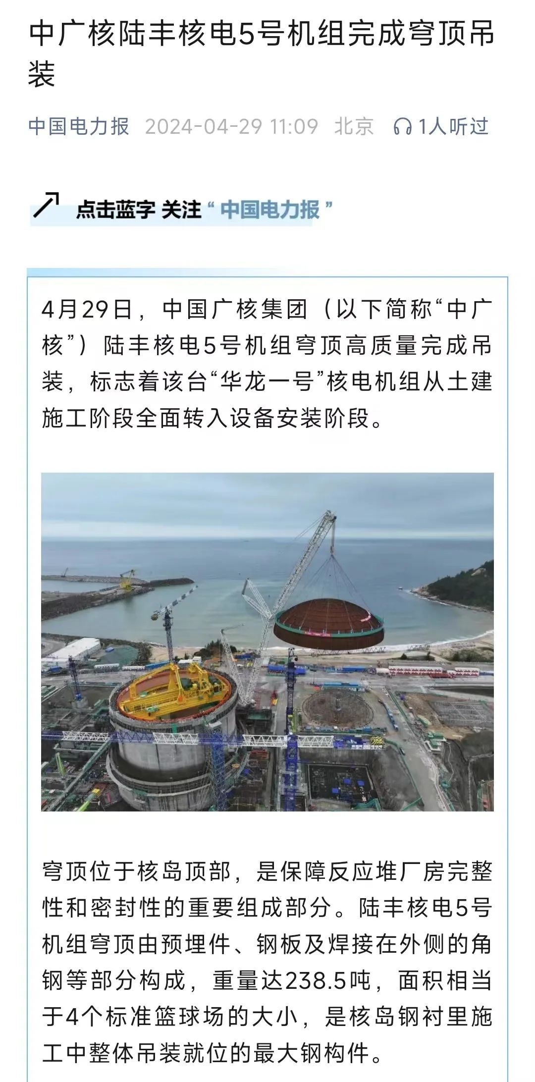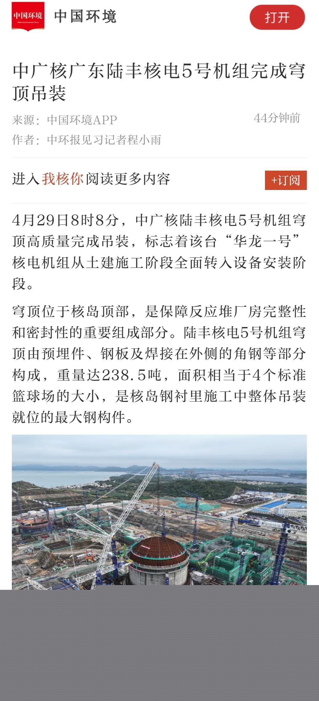 4月29日8時8分,中廣核廣東陸豐核電項目5號機組穹頂完成吊裝,標志著該臺“華龍一號”核電機組從土建施工階段全面轉入設備安裝階段。人民日報、新華社、央視等多家主流媒體對此進行聚焦報道。