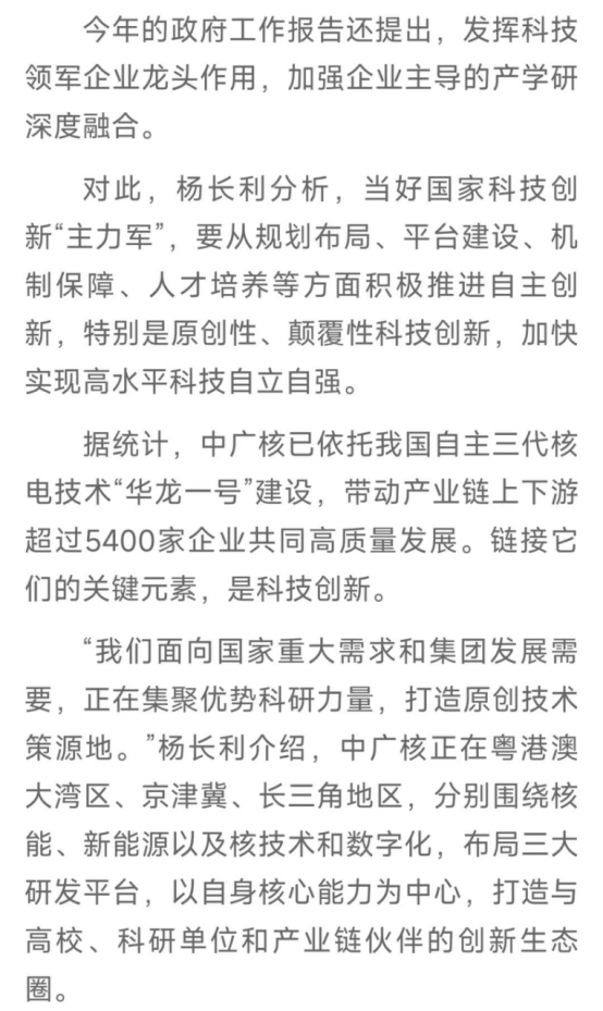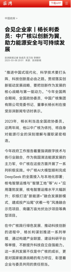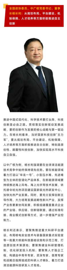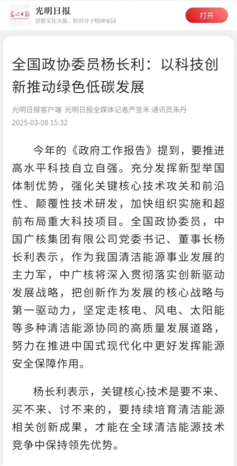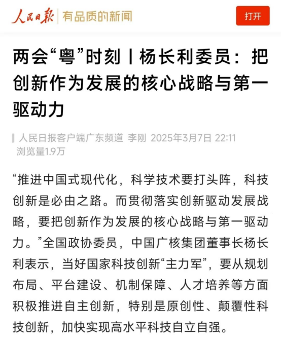 2025年全國兩會期間,全國政協(xié)委員、中國廣核集團(tuán)有限公司黨委書記、董事長楊長利積極履職盡責(zé),圍繞科技創(chuàng)新、清潔能源融合發(fā)展以及人工智能技術(shù)應(yīng)用落地等熱點(diǎn)問題積極發(fā)聲,人民日報(bào)、新華社、中央廣播電視總臺新聞聯(lián)播、科技日報(bào)等多家媒體關(guān)注和報(bào)道,產(chǎn)生廣泛的社會影響。