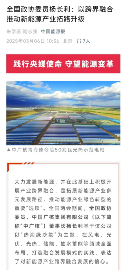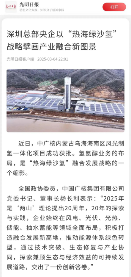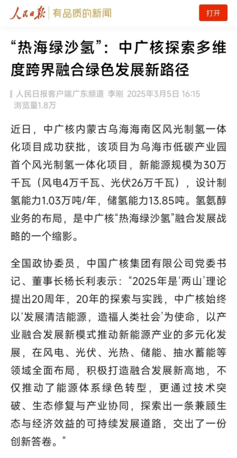 《人民日報(bào)》:中廣核正在風(fēng)電、光伏、光熱、氫能等領(lǐng)域全面布局,以“熱海綠沙氫”戰(zhàn)略擘畫產(chǎn)業(yè)融合新圖景,通過技術(shù)突破、生態(tài)修復(fù)與產(chǎn)業(yè)協(xié)同,探索出一條兼顧生態(tài)與經(jīng)濟(jì)效益的可持續(xù)發(fā)展道路。