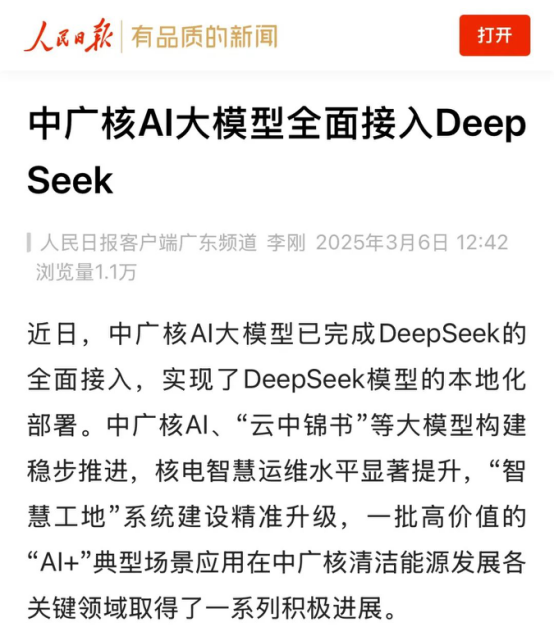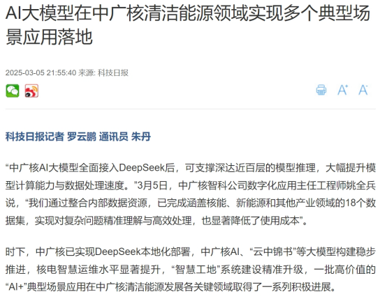 《新華財(cái)經(jīng)》:人工智能是今年兩會期間的熱點(diǎn)話題。“中廣核AI大模型已完成DeepSeek的全面接入,實(shí)現(xiàn)了DeepSeek模型的本地化部署。同時(shí),一系列核電特種機(jī)器人正在核電建造、運(yùn)維等領(lǐng)域大顯身手?!睏铋L利說,后續(xù)中廣核將進(jìn)一步探索人工智能與核電、新能源場景的深度融合,持續(xù)提升生產(chǎn)安全與效率。