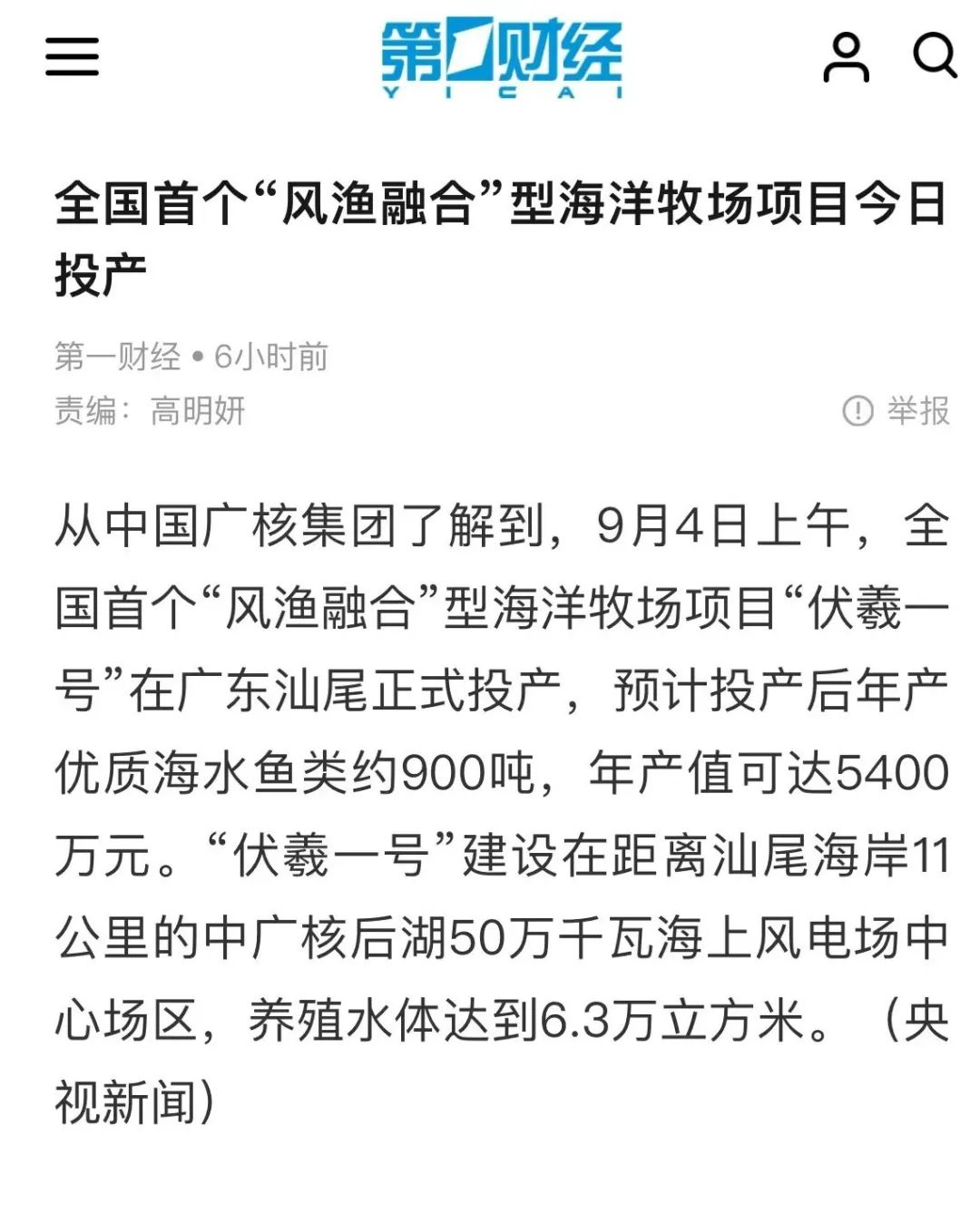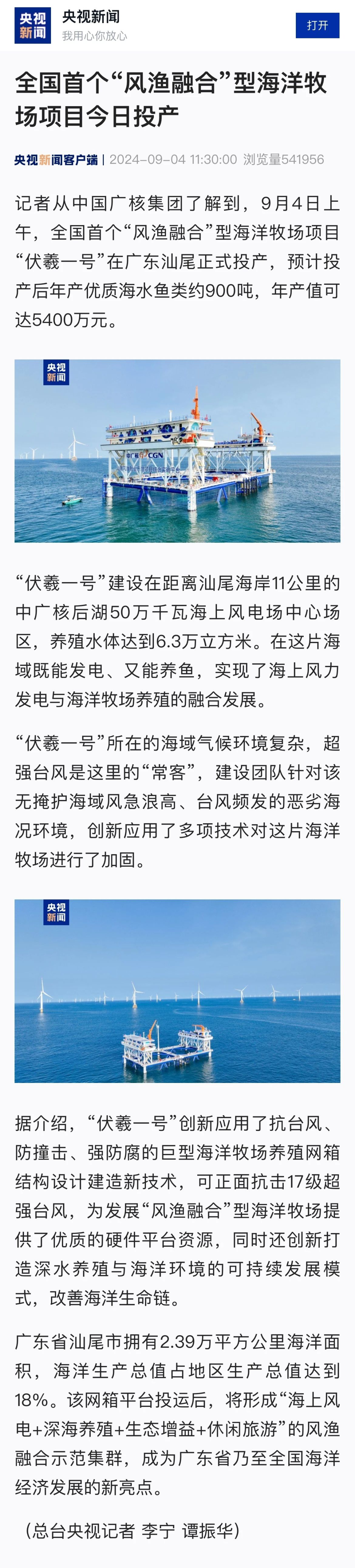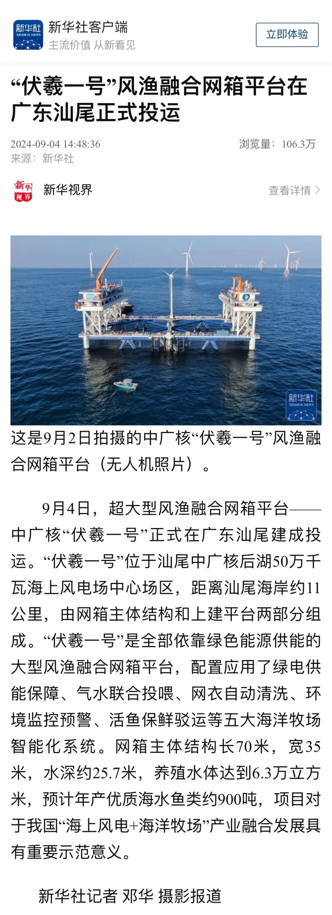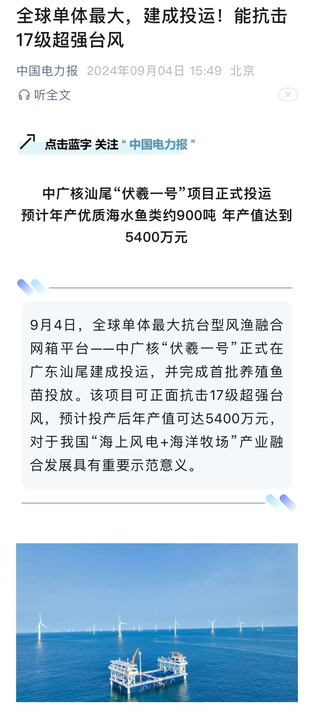 9月4日,中廣核汕尾“伏羲一號(hào)”風(fēng)漁融合項(xiàng)目正式投運(yùn),并完成首批養(yǎng)殖魚苗投放,該項(xiàng)目可正面抗擊17級(jí)超強(qiáng)臺(tái)風(fēng),預(yù)計(jì)投產(chǎn)后年產(chǎn)值可達(dá)5400萬元,對(duì)于我國(guó)“海上風(fēng)電+海洋牧場(chǎng)”產(chǎn)業(yè)融合發(fā)展具有重要示范意義。人民日?qǐng)?bào)、新華社、央視等數(shù)十家主流媒體對(duì)此進(jìn)行聚焦報(bào)道。