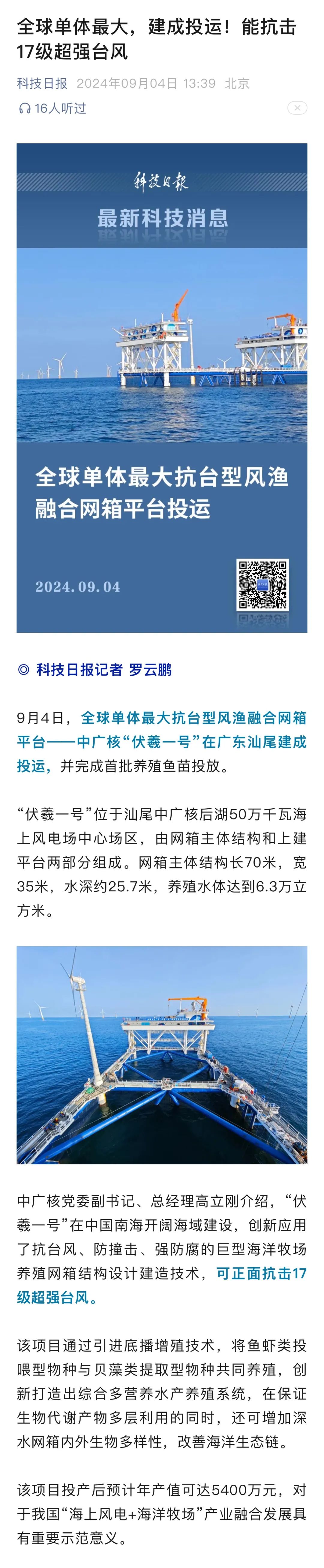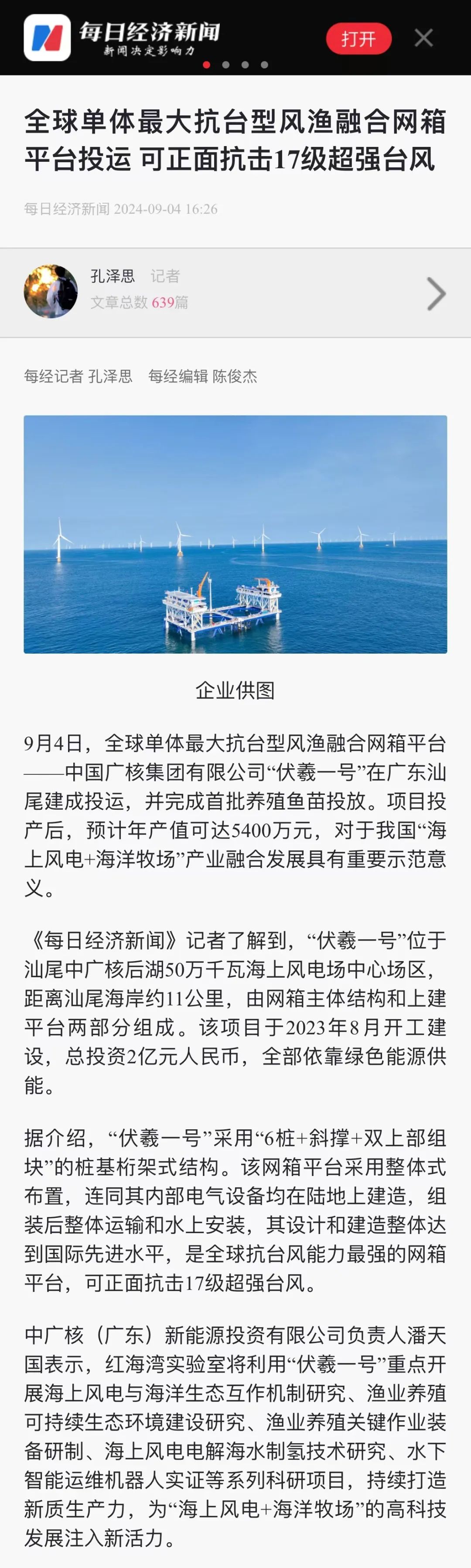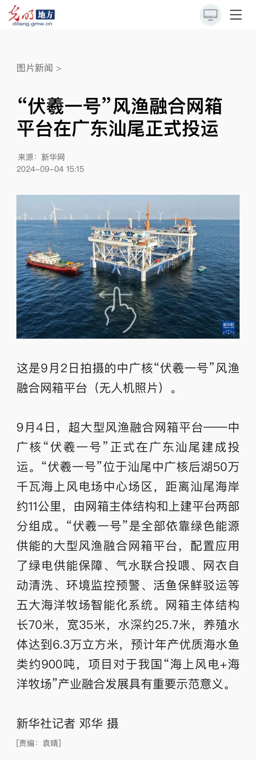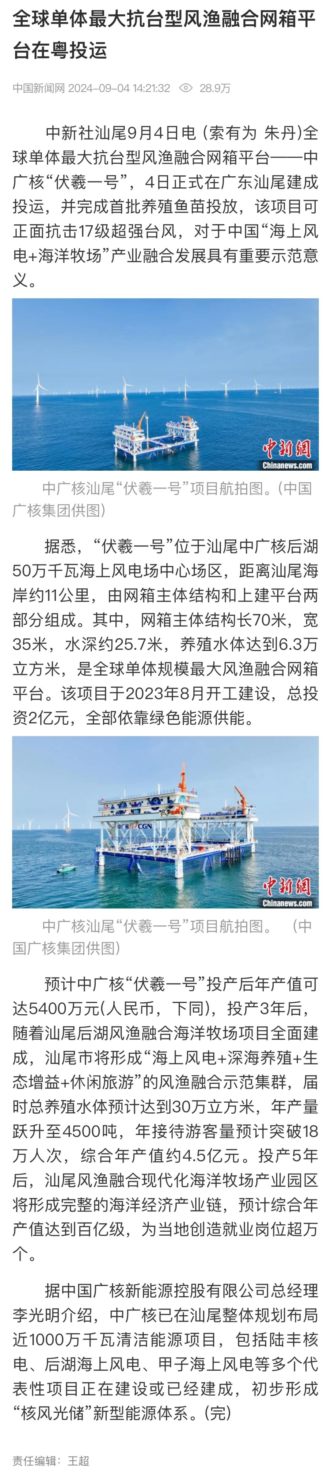 9月4日,中廣核汕尾“伏羲一號(hào)”風(fēng)漁融合項(xiàng)目正式投運(yùn),并完成首批養(yǎng)殖魚苗投放,該項(xiàng)目可正面抗擊17級(jí)超強(qiáng)臺(tái)風(fēng),預(yù)計(jì)投產(chǎn)后年產(chǎn)值可達(dá)5400萬元,對(duì)于我國(guó)“海上風(fēng)電+海洋牧場(chǎng)”產(chǎn)業(yè)融合發(fā)展具有重要示范意義。人民日?qǐng)?bào)、新華社、央視等數(shù)十家主流媒體對(duì)此進(jìn)行聚焦報(bào)道。